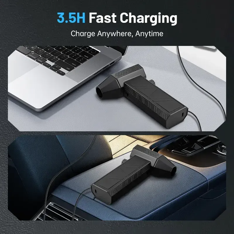 ·3. Adjustable Speed Control Features stepless speed adjustment so you can control the airflow exactly how you need it — from gentle airflow to powerful blast for deep cleaning. 4. Type-C Fast Rechargeable Equipped with a Type-C charging port for convenient and fast charging. Recharge easily with power banks, laptops, or adapters.